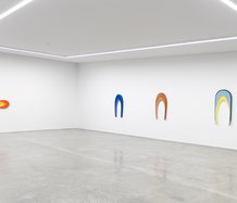 The fifth work, Kramer, is a dark brown field on which are short snippets of wiggly white string and various floating geometrical forms that lock in and around each other in space. A Formica-like blob and triangle of glossy red veneer hang beneath a golden bent wooden strip that seems to turn into flat cardboard as it extends. Scattered across the illusory picture plane are thick painted loops of blue that appear sewn into the brown field or passing through it.