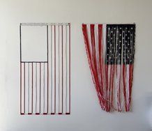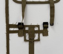 He has also been exhibiting painting experiments using light denim as a support, following the parallel grooves of this fabric as a guide for the direction of painted lines. This interest in the grain of the weave has developed into stitched canvas triangles that as a painted surface feature clashing directional vectors - randomly organised.