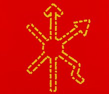 Textured paper, tonally gradated colour and sticky tape are used for cut out shapes or lines that gently move. There are lots of simple oval shapes that seem to refer to eighties Italian artists like Palladino or Cucchi, likewise sausages to the German artist Polke - mixed with incongruities like spaghetti descending from strange slits or flying horizontally like rippling flags.