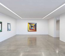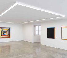 Underneath Noonmool, Puha (the plastic arcs) repeat on the floor the curved forms of the white gallery seating. Upstairs the two white and blue LED works, with their right-angled boxlike shapes and extended linear planes, exactly reference the short end wall near the window and the ventilation grilles on the floor. The more innermost one echoes the white slashes from the blind high up in the ceiling. It seems - in such a repetition of the linear traces of natural light - to reference the way the two massive inflatable Huggongs reflect, (literally) elsewhere on that same top floor, the ceiling’s fluorescent tubes (on their shiny polyvinyl chloride surfaces): jammed as they are against the sides of the winding staircase.