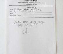 Resulting from experiments he carried out while having a residency in the Headlands Centre in San Francisco, these new poured paintings — besides referencing the wonderful installation he made a couple of years ago in Chrisstchurch Art Gallery—vaguely allude to the techniques of Dale Frank or Larry Poons, with the pouring technique of making a horizontal wooden support (bearing applied runny viscous paint) suddenly vertical and left that way to dry.