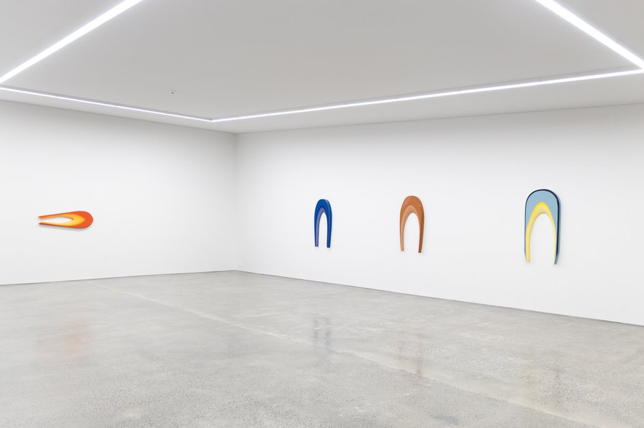 In Starkwhite, five unusual linear three-dimensional paintings by Melbourne artist Jim Roche (b.1989) cling to the wall as a strange sort of sculpture/drawing hybrid. Made of carved poplar, polystyrene foam, ink and synthetic resin that collectively draw on surfboard and skateboard technology, but looking eviscerated, these glossy minimalist ‘A-frame’ sculptures have an impeccable industrial finish with no traces of manual colour application—only delicately sprayed airbrush. Colour radiates from within the depths of the resin, not from the outer surface. Three or four hues are used for each.