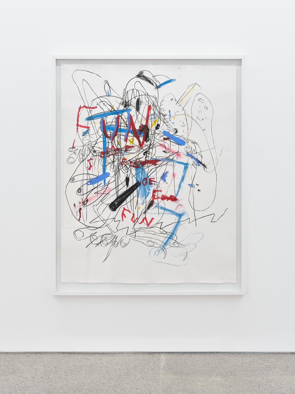Frenetic unstable energy from a hyper-jittery twitching hand dominates. The word FUN is repeatedly stated as a driving motivation in the marks’ manufacture, causing the mood within the Pollocklike field to become calculatedly chaotic, piecemeal, infantile and (if it antagonises) downright giggly. Yet more than baiting is going on in this thinly spread poisonous concoction.