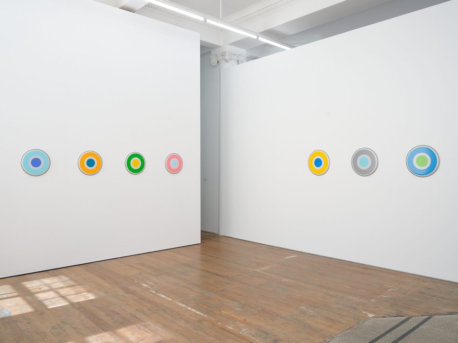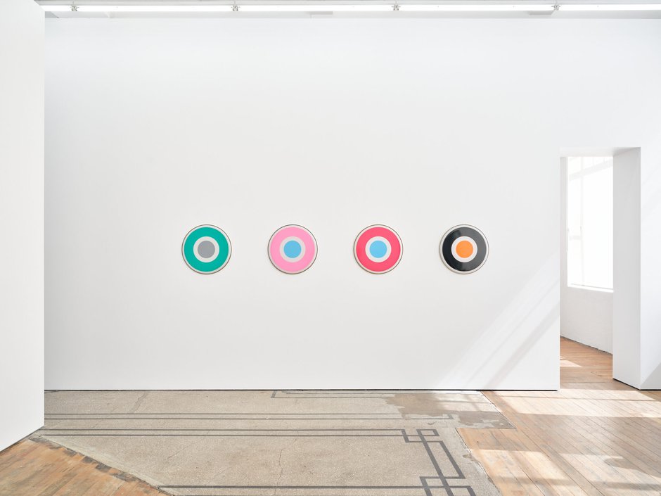 The 25 works on show here were also chosen by Christopher Cook and David Raskin years earlier to tour the American Midwest in 2005-6 under the same title, as a survey. Lett’s accompanying publication therefore usefully reproduces the original contextualizing twenty-year old essay, and we note that Dashper’s project (then and now) wittily and without irony uses a child’s bass drum as a metaphor for insistent and incessantly ‘loud’ self-promotion. This is seen as necessary in a tough-minded, often resistant, artworld, and utilizing drum skins to present circular paintings that feature austere but gorgeous Minimalist geometry and deliciously sensual colour.