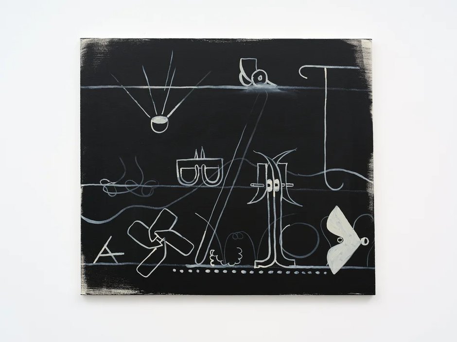 These paintings are quite graphic in the sense that they are amusing, thin-lined, cartoonish drawings in white paint on dry-brushed black backgrounds. Or the reverse. Elegant black-lined drawings on raw canvas. Very pale buff duck.