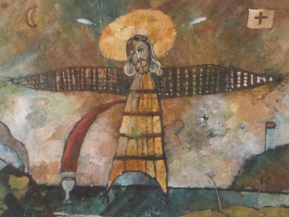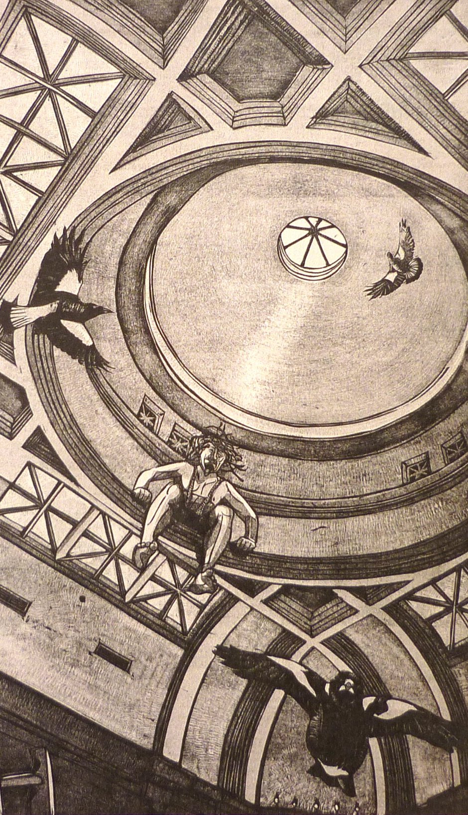 Lost Album #18, by Toni Mosley juggles elements of old photographs with collaged effects to rescue memories, while Graham Hall, the outright winner of the print section, channels McCahon, who channeled Uncle Frank, in his work, The 14th Station of the Cross: The Ascension with floating bodies inside the domed structure of the Sarjeant Gallery.