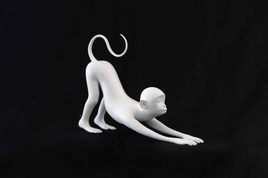 Three white resin (mostly animal) floor sculptures and seven paintings of spiraling coloured oblique triangles are presented together in this current Seung Yul Oh exhibition. Of the former, there is a bending monkey that appears to be greeting the visitor, or in a position of contrition, or else praying as if in a temple. Then again it might be stretching, anticipating some frenetic or arduous exercise. There is also a white crab standing up on its back legs, peering up at the gallery intruder.