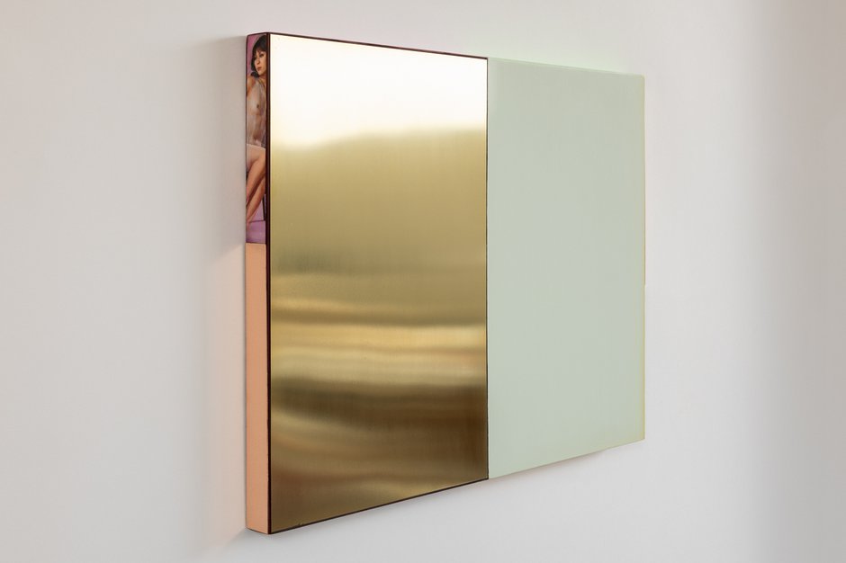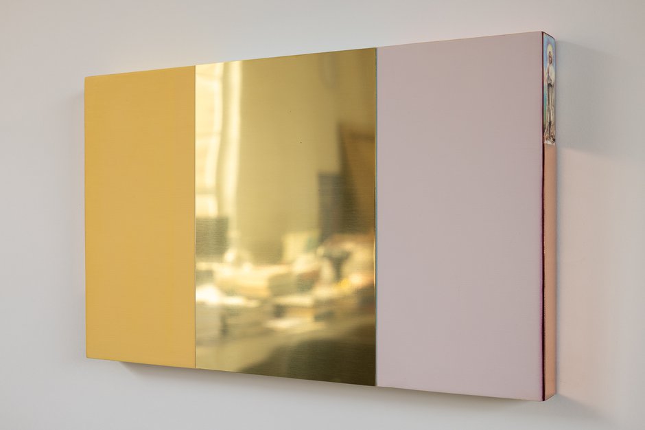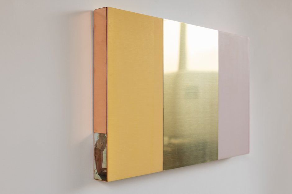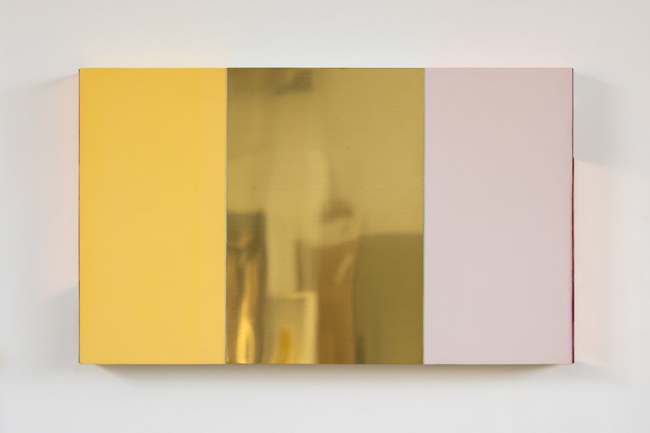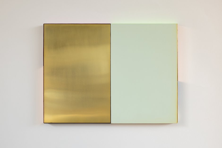 In these highly unusual couplings or triplets of mono pastel-coloured and reflective metal rectangular panels, it is their odd distinctive sides that we naturally first concentrate on. They feature many options. These for example include vertical lenticular edges that present moving narratives that involve saints; fluorescent-coloured top edges that reflect on to the gallery walls above and impossible to photograph; or else thin dyed strips of transparent silk dangling from their righthand side.