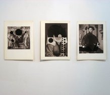 Hung from clunky grey screens, these incorporate faked sociological and statistical charts or graphs, culled from enlarged text book pages. Made with a wide range of traditional media, including collage, paint, pencil, ink, tape, charcoal and crayon, they look like very odd archaic posters from some very peculiar ranting institution.