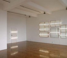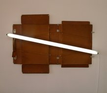The dramatic umber work by the entrance, ‘Inter-island’, takes advantage of the dark Endeans Building landing. In the gallery proper the polished parquet floor mirrors a rippled, disintegrating version of the bright linear bars.