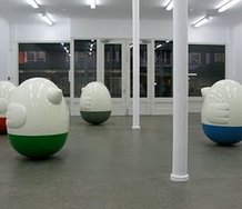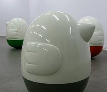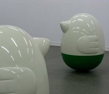 They shine like creamy porcelain and have glossy coloured bases of different hues. Each one has a mechanism hidden inside that with different sorts of movement will make sounds. One tinkles, another clangs, a third a grinding rumble.