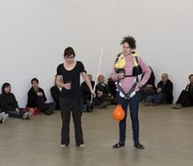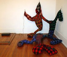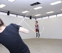 Frankovich is a gymnast preoccupied with linear vectors. She thinks in terms of vertical drops or lifts, horizontal conveyancing and diagonally angular ascents or descents. Her body is a point in motion co-ordinating with other point/bodies. Dot becomes line which transmutes into plane.