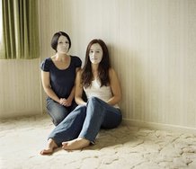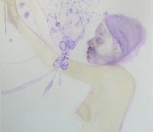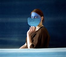 In contrast to her last exhibition where she made ‘portraits’ where heads, faces and whole bodies were hidden from view, this new Layla Rudneva-Mackay show uses exposed faces, but still hidden behind make up - white-faced or tinted pancake, foundations and creams. The six photographs here in Starkwhite’s new back gallery allude to the theatre: they are stagey with appropriately coloured backdrops, costumes and props. They tease out the notion of applied facial makeup as rudimentary mask - not for disguise though, but accentuation of mood. An elaboration of a psychological state or - more permanently, a character trait.