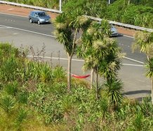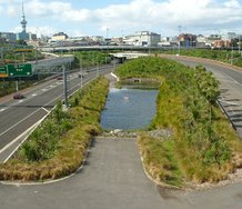This ‘resort’ seems to be some sort of stormwater outflow that has been cosmeticised to help beautify the motorway. As such it is a good idea, but one which because it has been successful, has also been invisible. Hundreds of cars drive past it every day, with not one driver ever realising it is there. Just an occasional haven for aquatic birds and nosey-parker artists.