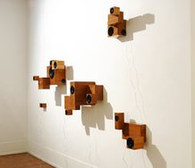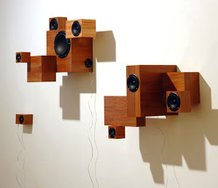 But these are not model houses but wired up, super sharp, music speakers, made of chipboard and covered with veneer. The five speaker clusters emit a soundtrack that is part of the sculptural experience, for the noises energetically move around and come and go. We hear simple sounds like a dripping tap, laughter, whistling, or solo violin.