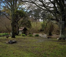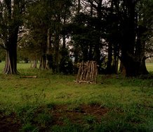 Because Adams uses a large-format 8 x 10 inch field camera it is wonderful to see untrimmed prints pinned to the gallery wall that really provide a sense of the architecture around Waitere’s carvings. Glossy with remarkable acuity, the tonal range of the C-prints is more pronounced than the same images on the published page. They have far greater depth, and often wide images are made by positioning three large coloured photographs side by side.