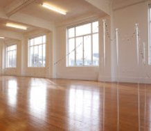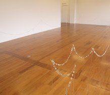Shape; tone; line; dot - all in an unusual in situ presentation. What is Frater up to here? There is a strange subtext of foul tempered violence that the space is on the receiving end of; as in slam that wall, stomp that carpet. The nap is scuffed up. Lots of boot marks, some wheels too. The ‘string’ could be wool pulled out of the edges of the weave.